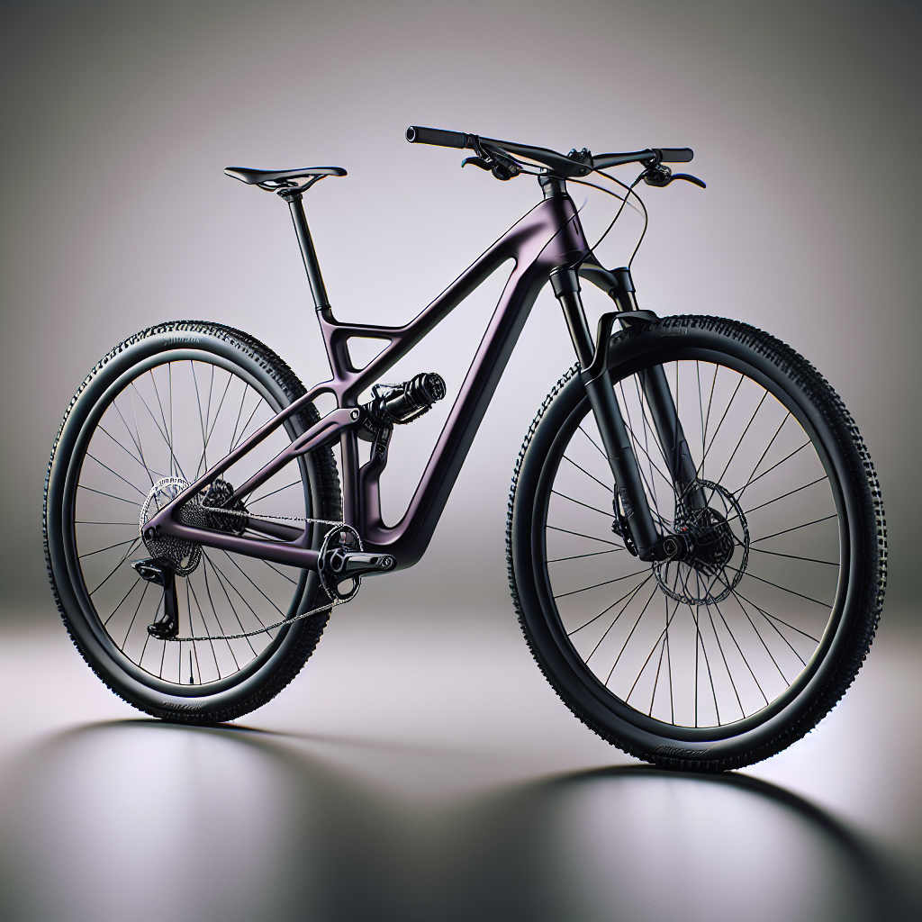IMAGE_PROMPT: Photo de studio minimaliste ultra-réaliste d’un VTT cross-country de compétition prototype couleur violet profond, cadre carbone avec haubans flex-stays sans pivot visible sur l’arrière, suspension arrière compacte, lignes modernes et épurées, roues 29 pouces, pneus XC à crampons fins, cockpit intégré minimal, transmission mono-plateau, freins à disque, éclairage softbox diffus, fond gris clair uni, ombre douce au sol, angle trois-quarts avant gauche, rendu très net type catalogue technique, aucun texte ni logo lisible, aucune présence humaine, haute résolution, style photographie produit premium.